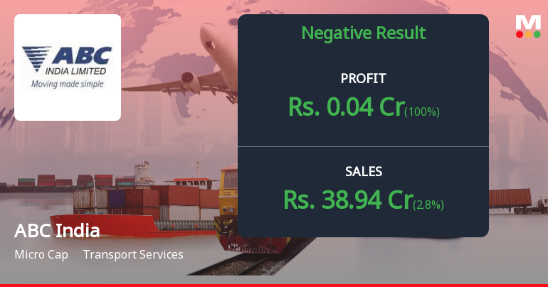 2025-11-14 09:21:39ABC India Ltd., a Kolkata-based freight forwarding and logistics company, reported a marginal quarterly net profit of ₹0.04 crores in Q2 FY26, a 100.00% increase from ₹0.02 crores in Q1 FY26 but a sharp 92.31% decline compared to ₹0.52 crores in Q2 FY25. The micro-cap logistics player, with a market capitalisation of ₹42.25 crores, continues to face operational headwinds as revenue contracted 12.83% year-on-year to ₹38.94 crores, whilst operating margins turned deeply negative at -3.88%.